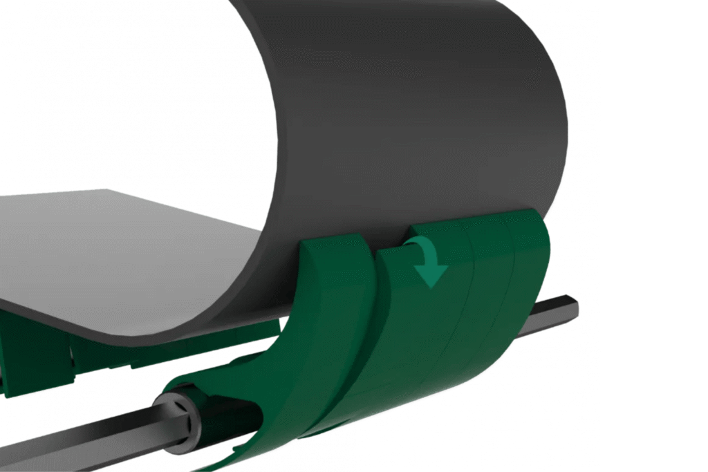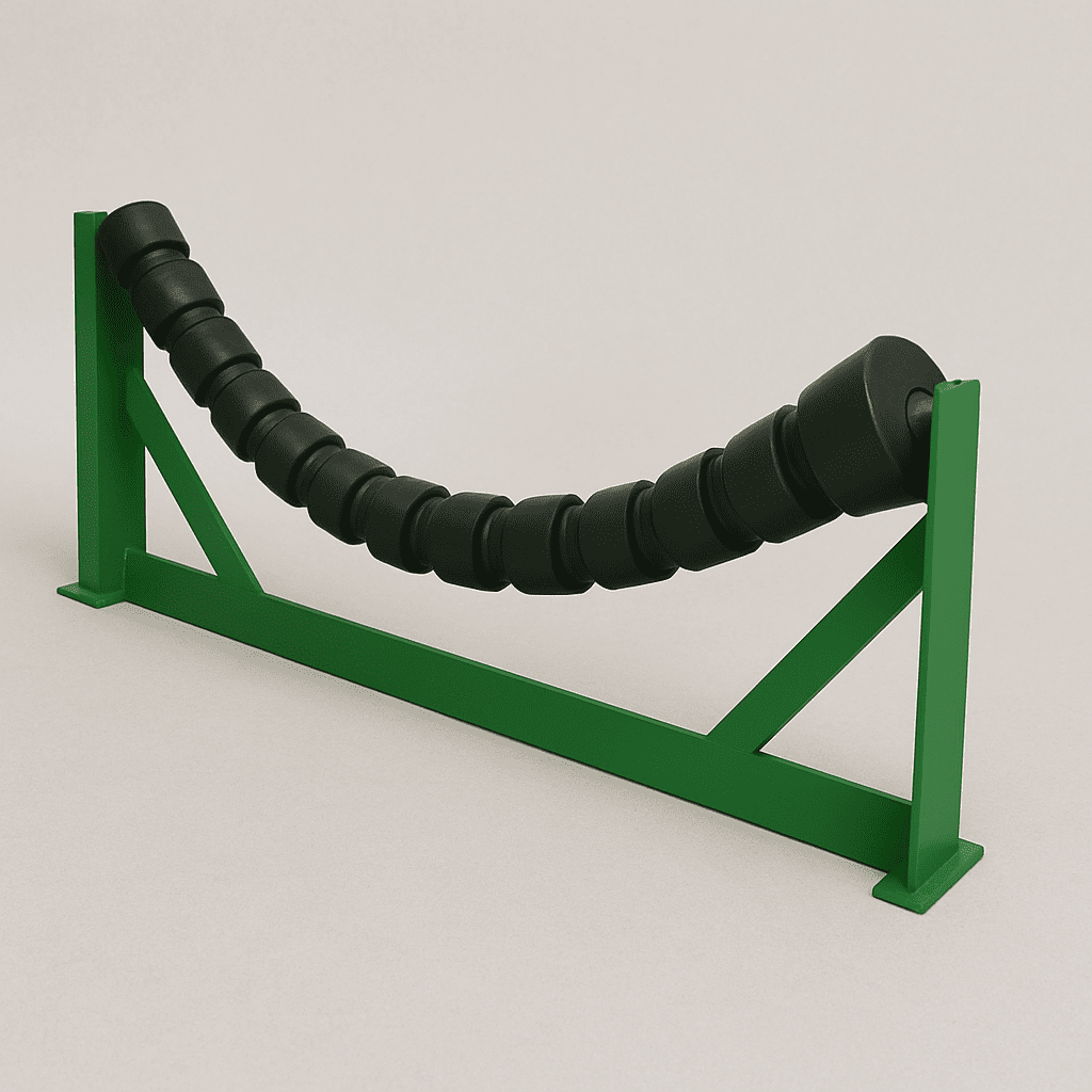 I rulli flessibili sono composti da un’anima in acciaio flessibile rivestita in gomma neoprene vulcanizzata, con anelli resistenti all’abrasione (neri o bianchi per uso alimentare). Sono dotati di cuscinetti protetti montati su supporti in ghisa. Il nastro aderisce formando una conca da 20° a 45°. Ideali per trasportatori con carichi leggeri/medi e basse velocità, anche in ambienti difficili. Leggeri, resistenti e autopulenti.