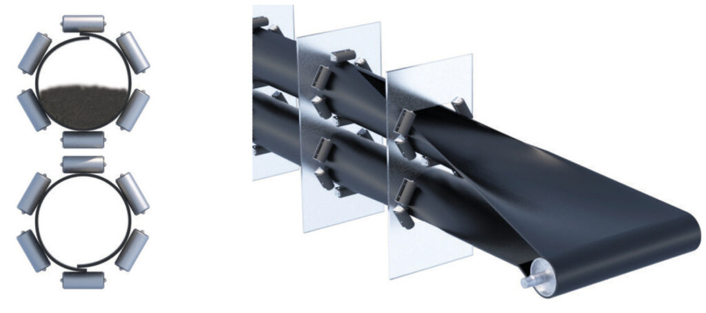 L’attenzione crescente alla protezione dell’ambiente, soprattutto in prossimità di parchi naturali o aree residenziali, ha spinto allo sviluppo dei nastri tubolari. Questi nastri, disponibili nelle varianti FLEXPIPE® con carcassa in tessuto sintetico multitela e SIDERPIPE® con carcassa in cavi d’acciaio, sono progettati per garantire un’elevata flessibilità trasversale, permettendo loro di assumere facilmente la forma tubolare nelle zone dove questa configurazione è vantaggiosa.